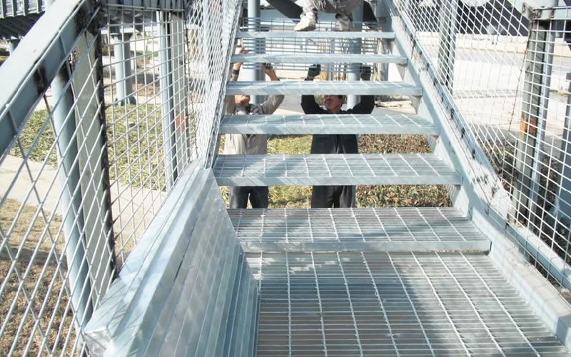 安平縣歐卓絲網(wǎng)制品有限公司生產(chǎn)的樓梯踏步板根據(jù)安裝情況分為焊接固定和螺栓固定。其中焊接固定的樓梯踏步板即鋼格柵,螺栓固定的需要給鋼格柵加上65X5mm的扁鋼作為側(cè)板。據(jù)梯防滑要求可分為有前護板(花紋板或條鋼)的和無前護板的兩種。